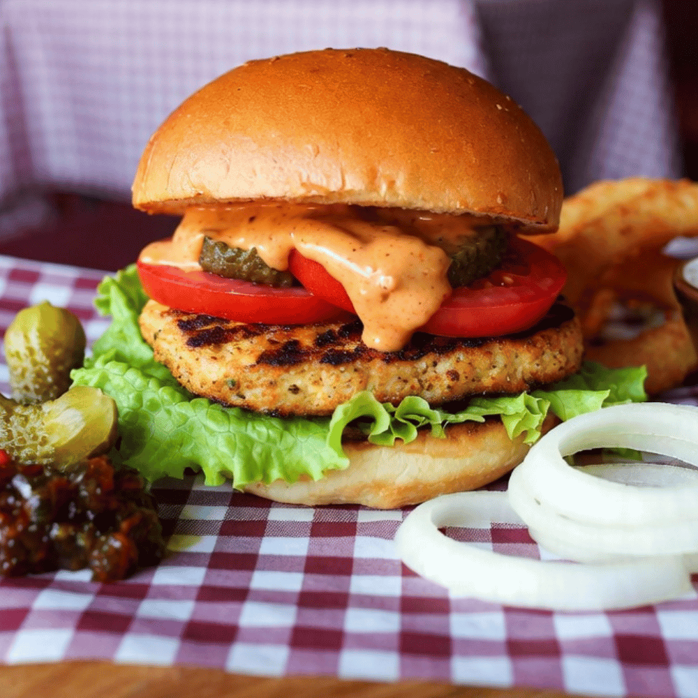 Be the first to review “Belle Vue Burger, cheesburger, with spicy nduja sausage, gherkins, onion rings & burger relish.”