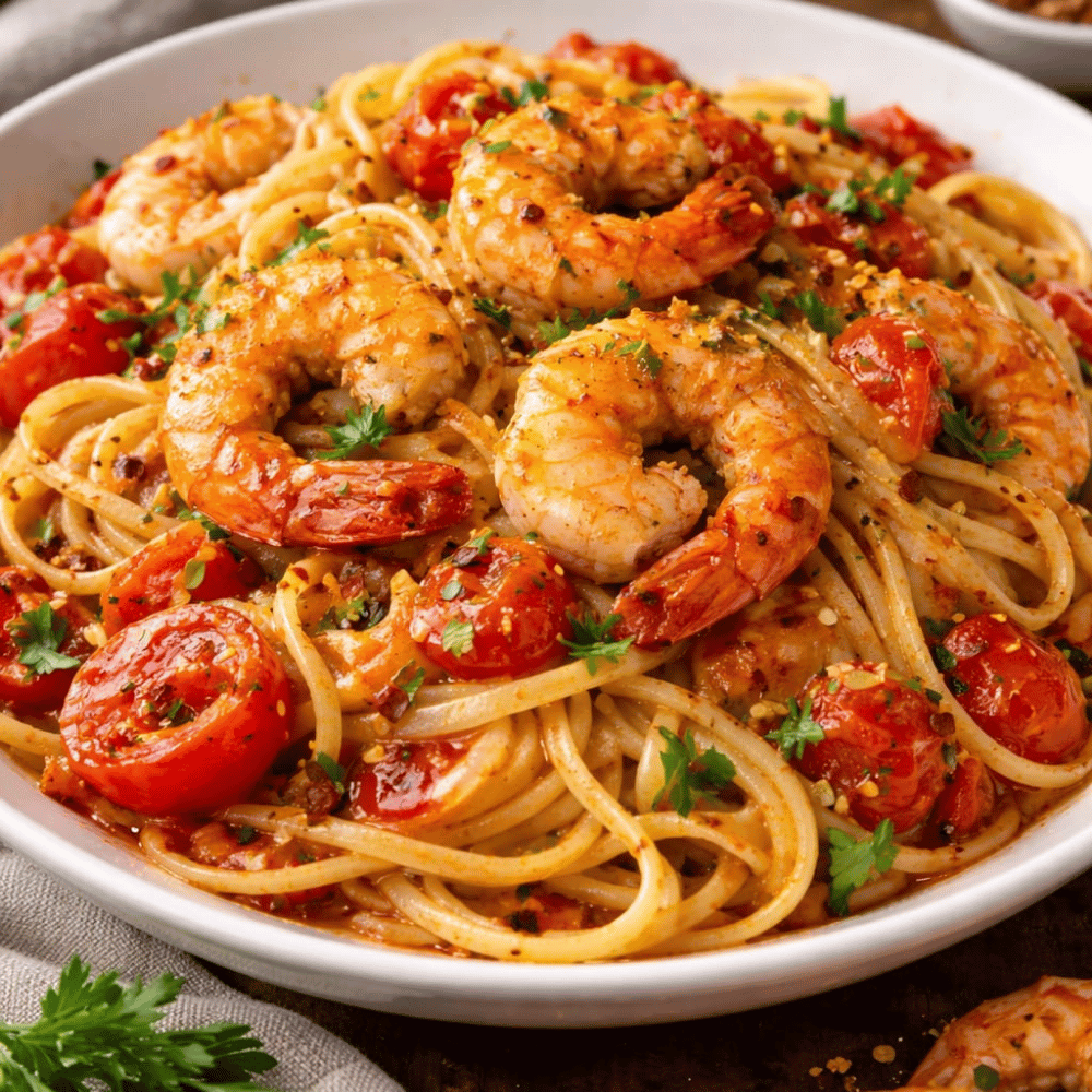 King Prawn Provencale linguine with king prawns, cherry tomatoes & onions, in a red pepper and tomato ragu with lots of garlic